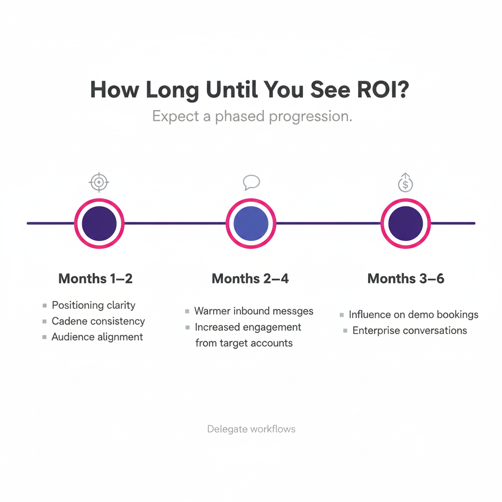 On Shruthi’s LinkedIn profile, this functions as a reputation infrastructure rather than a direct response channel. The ROI compounds through shorter sales cycles, higher trust in conversations, and qualified inbound interest.